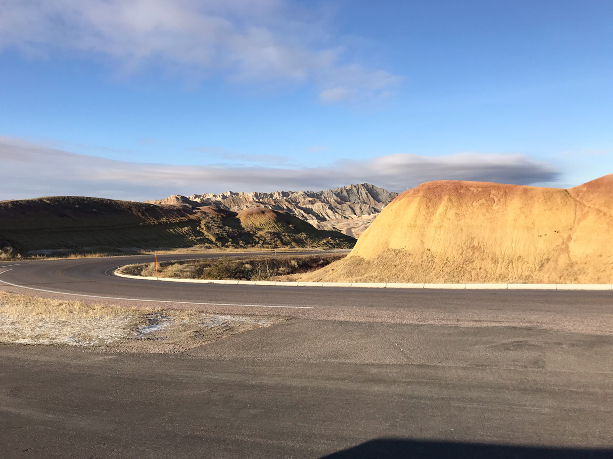 Winding Road through Golden Hills and Rocky Badlands Formations in Clear Morning Light – Royalty-Free Landscape Reference Photo for Scenic Drives, Desert Terrain, and Wilderness Exploration”